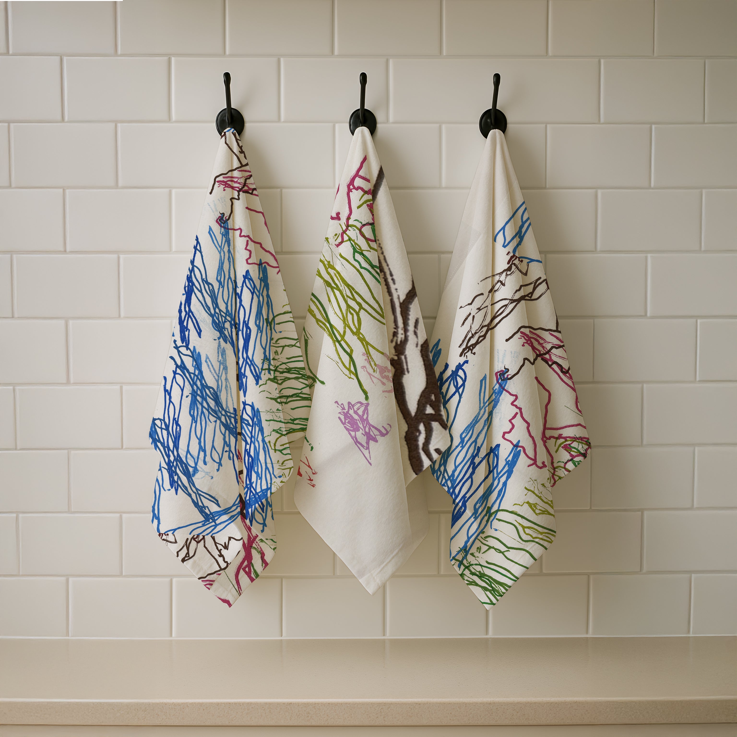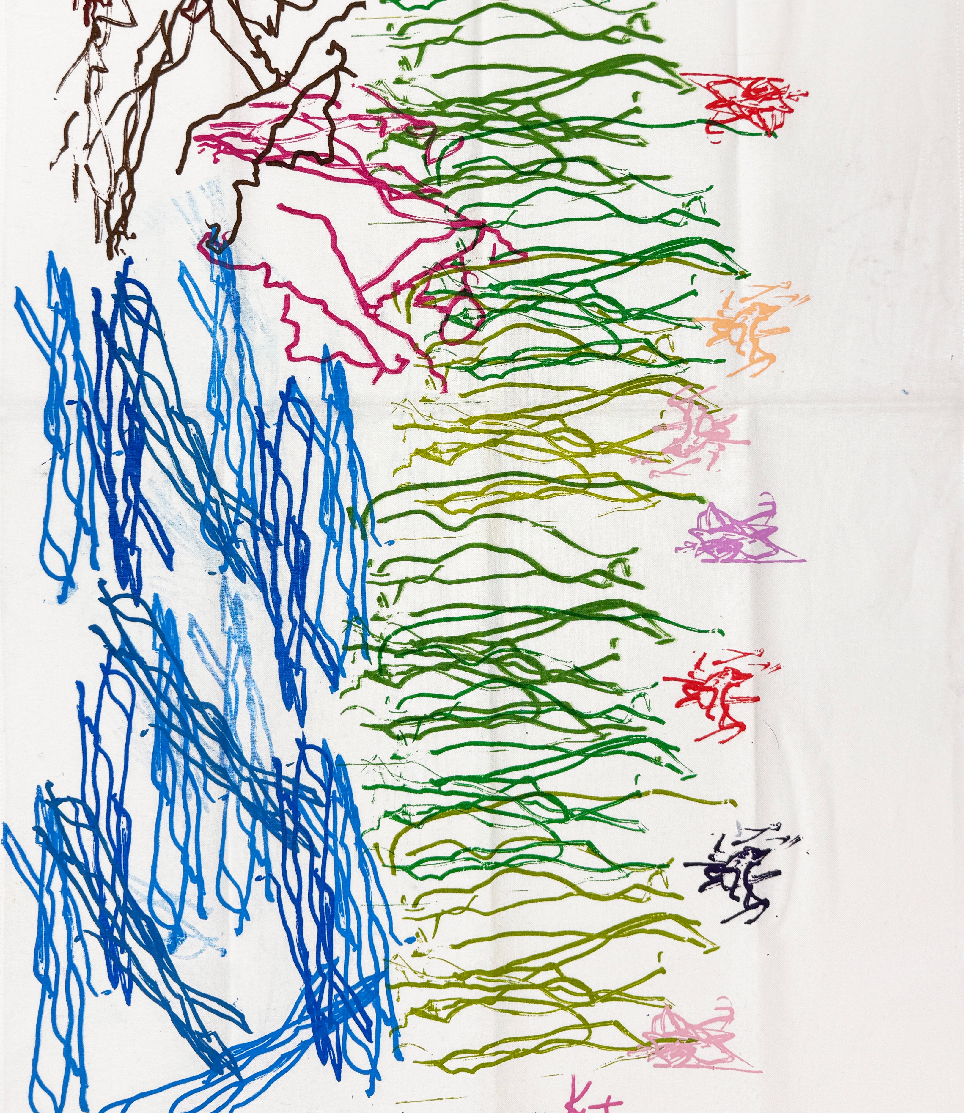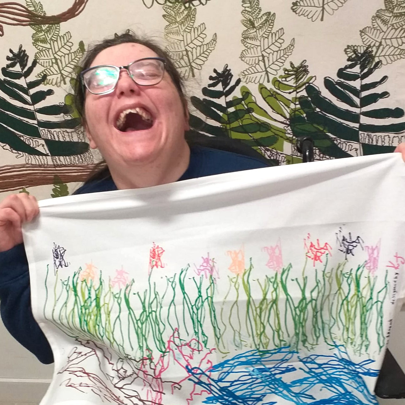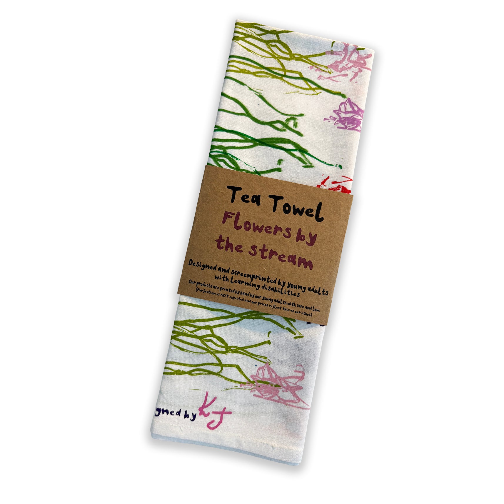 A truly lovely High-quality cotton tea towel featuring Flowers by the stream, A design by Kelsey and screenprinted by our team of young adults with disabilities at Post19.
