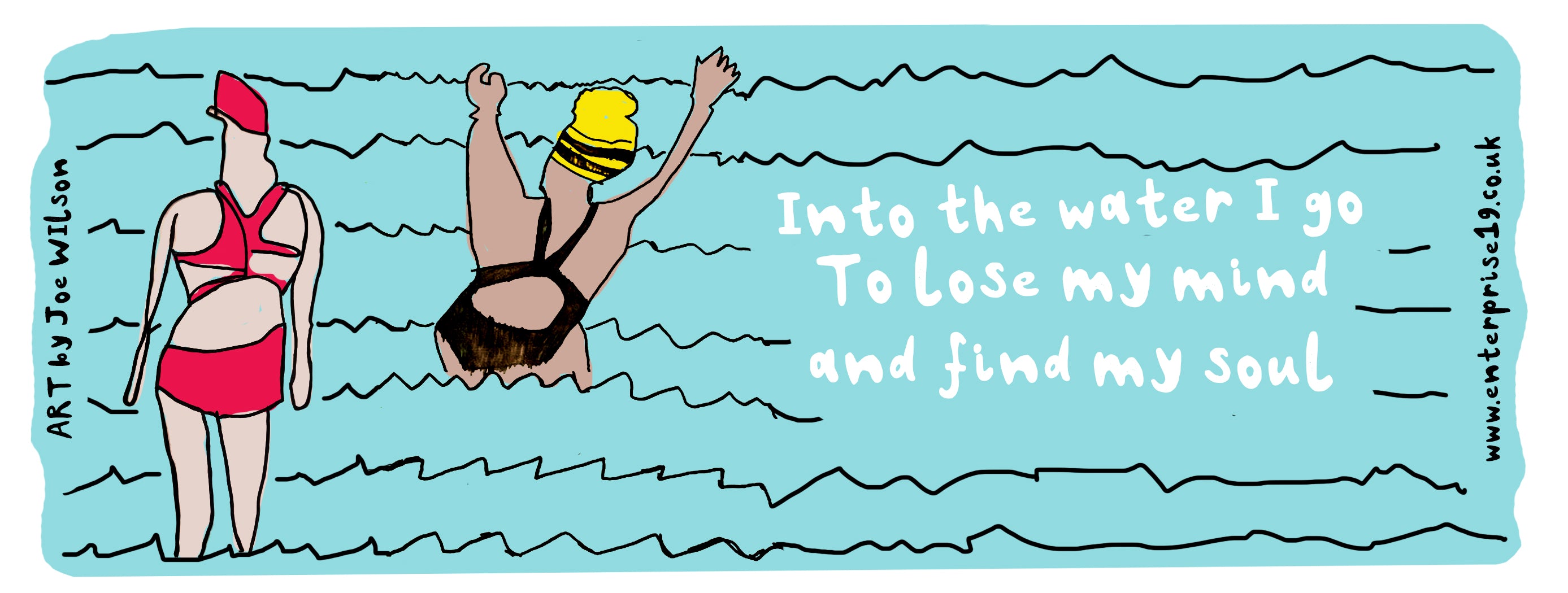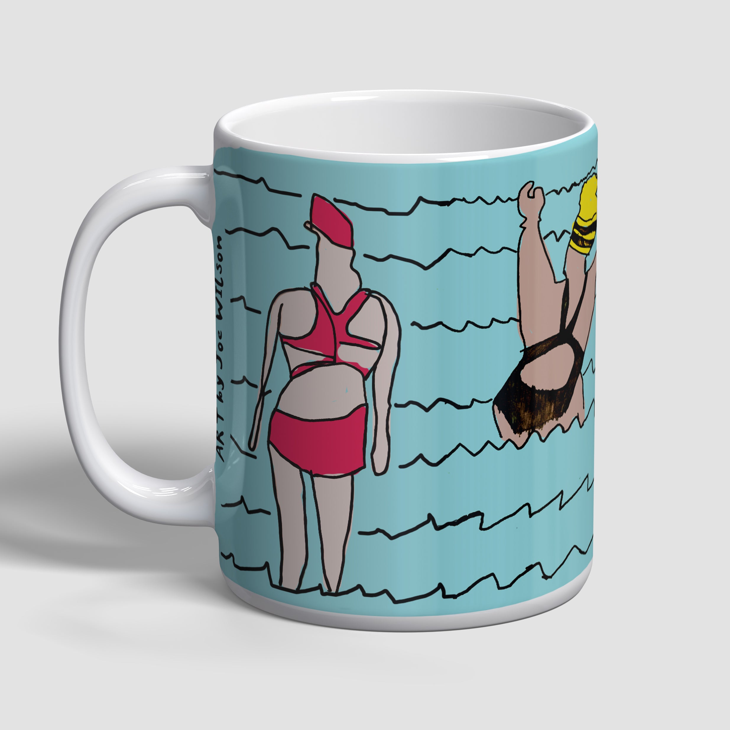 11oz Ceramic mug Illustrated by Joe W. is the perfect gift for: people who like Wild swimming, people who hate wild swimming but know it's good for them so do it anyway, people who get a dry robe for Christmas so feel like they're a wild swimmer, and of course... people who like mugs.